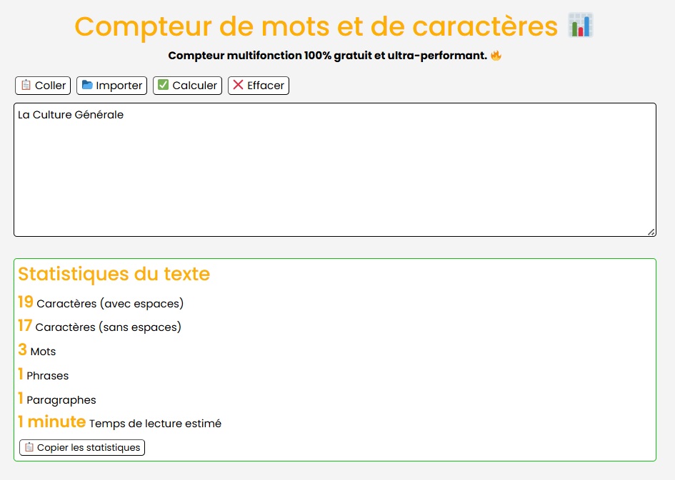 Ces statistiques sont présentées dans une interface claire et visuellement attrayante, permettant d’évaluer rapidement la structure et la longueur de votre texte.