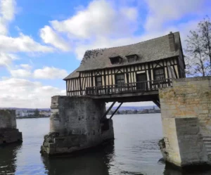 - Cette maison à colombages du XVIe siècle repose sur deux piles d’un ancien pont médiéval, sur la Seine, à Vernon, dans l’Eure.