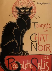 - Théophile Alexandre Steinlen (1859 – 1923) était un artiste du Montmartre de la Belle Époque à l’œuvre variée. Il était engagé dans l’anarchisme. Cette affiche est une lithographie publicitaire pour un cabaret.